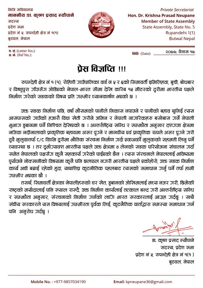 रुपन्देही निर्वाचन क्षेत्र नम्बर १ को कबाट निर्वाचित प्रदेश सभा सदस्य न्यौपानेले भारतले आफ्नो निर्वाचन क्षेत्र अन्तरर्गत पर्ने रुपन्देहीको रोहीणी गाउँपालिका वडा नं ५ र ६ का ईमिलीहवा, बुची, बोधवार र बिष्णुपुरा गाउँ डुवानमा पार्ने गरी राजमार्ग निर्माण गर्न शुरु गरेको विज्ञप्तिमा उल्लेख गर्नु भएको छ ।