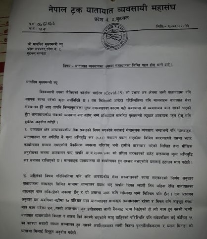 ज्ञापनपत्रमा कोभिड १९ को माहामारीको अवधीसम्मको यातायात व्यवसायीले लिएको बैक तथा वितिय संस्थाको ऋणको व्याज मिनाहा र किस्ताको पुनरताजकिकरणका लागि वजेटमा व्यवस्था गर्न माग गरिएको छ । त्यस्तै महामारीको समयमा पनि ट्रकका चालक र सहचालकले जोखिममोली सवारी संचालन गरेकाले उनिहरुको सुरक्षाको प्रबन्ध मिलाउनुका साथै कोेभिड १९ को माहमारीमा अग्रपन्तीमा खटिने सरहको बीमाको व्यवस्था मिलाउन माग गरिएको छ ।