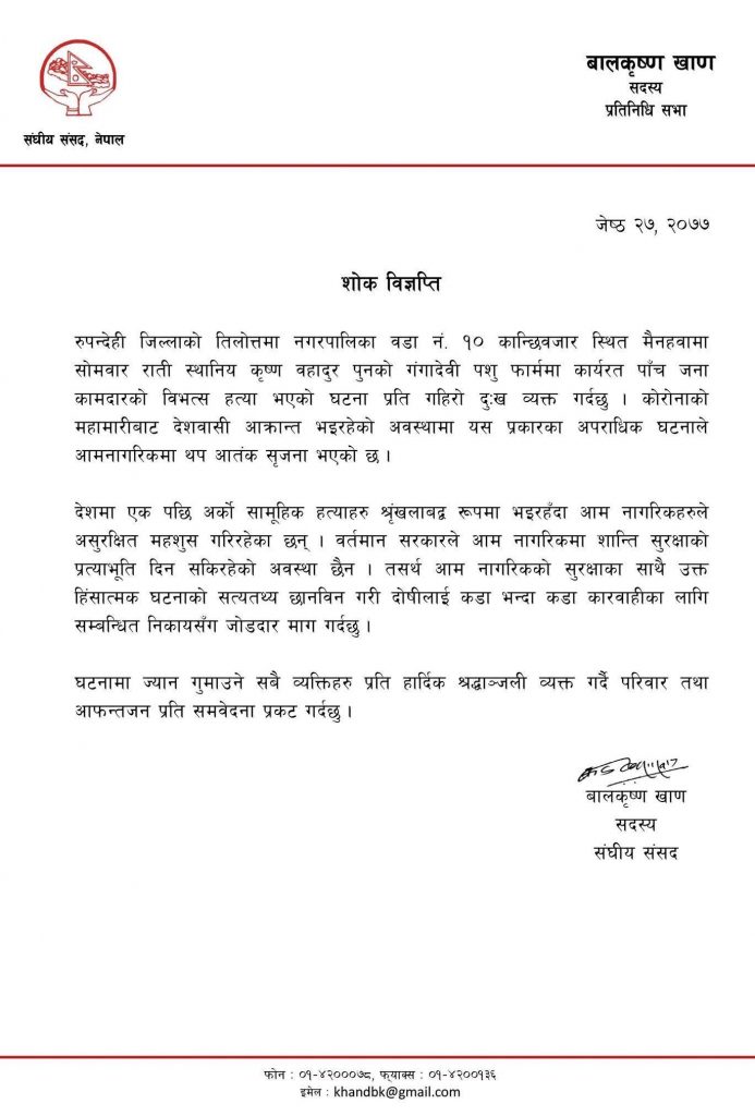 सांसद खाँणले विज्ञप्ति मार्फत आम नागरिकको सुरक्षाका साथै रुपन्देहीको कान्छिबजारमा भएको हिंसात्मक घटनाको सत्यतथ्य छानविन गरी दोषीलाई कडा भन्दा कडा कारवाहीका लागि सम्वन्धित निकायसंग माग गर्नुभएको छ ।