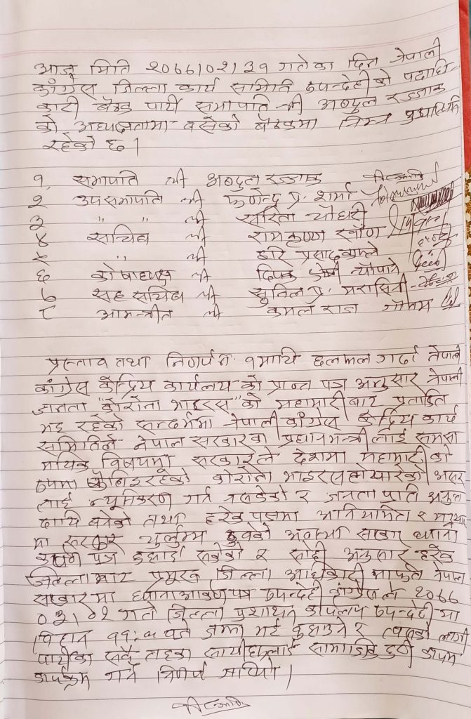 नेपाली काँग्रेस जिल्ला कार्य समितिका पदाधिकारीहरुको शनिबार बसेको बैठकले नेपाली जनता कोरोना महामारीले प्रताडित भईरहेको सन्दर्भमा सरकारले यसको असरलाई न्यूनिकरण गर्न नसकेको र जनता प्रति अनुत्तरदायी बनेको आरोप लगाएको छ । हरेक पक्षमा अनियमितता र भ्रष्ट्राचारमा सरकार चुर्लुम्म डुबेको अवस्थामा बिरोध स्वरुप सरकारलाई ध्यानाकर्षण पत्र बुझाउने कार्यक्रम रहेको नेपाली काँग्रेस रुपन्देहीका सभापति अब्दुल रज्जाकले बताउनु भयो ।
