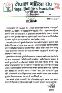 नेपाल महिला संघकी सभापति गंगा शाहीले शुक्रवार जारी गरेको विज्ञप्तीमा कसैलाई शारीरिक रूपमा बन्धक बनाउनु र उसको इक्षा विपरित कागजपत्रमा सही गराउनु सामान्य बयान मात्र नभएर मुलुकको फौजदारी कानुन आकर्षित गर्ने गम्भीर घटना हो भनिएको छ ।