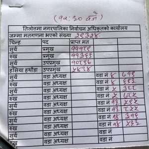 तिलोत्तमा, ८ जेठ । रुपन्देहीको तिलोत्तमा नगरपालिकामा जारी मतगणनामा नेपाली कांग्रेसका मेयरका उम्मेदवार रामकृष्ण खाँणले अग्रता लिएका छन् । दिउसो १२.३० वजेसम्म २९ हजार ३२४ मत गणना हुंदा खांणले नेकपा एमालेका उम्मेदवार मोहन चापागाईलाई १७७ मत अन्तरले पछि पार्दै अग्रता लिएका छन् ।