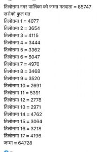 तिलोत्तमामा अहिले सम्म बडा नम्बर १, २, ३, १५, १६, १७ को मतगणना कार्य सम्पन्न भएको छ भने ४, ५, १३ र १४ को मत गणना जारी छ । मत गणना सकिएका ६ वडा मध्ये २, ३, १६ र १७ नेपाली कांग्रेसले जितेको छ भने १ र १५ एमालेले जितेको छ ।