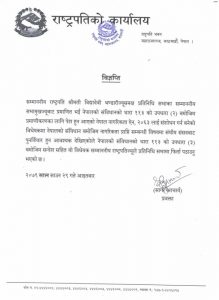 राष्ट्रपतिले १५ दिनभित्र विधेयक प्रमाणीकरण गर्ने वा फिर्ता गर्ने निर्णय लिइसक्नुपर्ने संवैधानिक व्यवस्था छ । संवैधानिक व्यवस्था अनुसार सोमबारसम्ममा प्रमाणीकरण वा फिर्ता गर्ने समय थियो ।