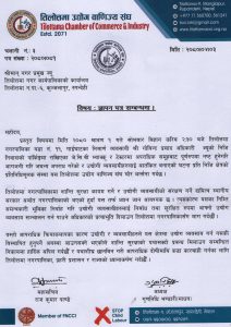 तिलोत्तमा । तिलोत्तमा उद्योग वाणिज्य संघ, रुन्देहीले उद्योगी ब्यवसायीहरुलाई निर्वाध तथा सुरक्षित रुपमा आफ्नो उद्योग ब्यवसाय सञ्चालन गर्न पाउने अधिकारको प्रत्याभूति दिलाउन माग गरेको छ । संघले नगरमा शान्ति सुरक्षा कायम गर्ने र उद्योगी ब्यवसायीको संरक्षण गर्ने दायित्व स्थानीय सरकार तथा नगरपालिकाको भएकाले यस तर्फ ध्यान दिन नगरपालिकाको ध्यानाकर्षण गराउंदै तिलोत्तमा नगरपालिकामा ज्ञापन पत्र बुझाएको छ ।
