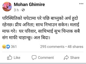 घिमिरेले आफ्नो फेसबुक स्टाटसमा लेखेका छन्–‘परिस्थितिको चपेटामा परे पछि बाच्नुको अर्थ हुदो रहेनछ । प्रीय अनिता, साथ निभाउन सकेन । मलाई माफ गरे । घर परिवार, साथिभाई शुभ चिन्तक सबै संग माफी चाहान्छु । अल बिदा ।
