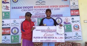 रुपन्देही क्रिकेट संघको आयोजना तथा ड्रिम युनिक कन्सलटेन्सी प्रालि, बुटवलको मुख्य प्रायोजनामा जारी प्रतियोगिताको विजेता टिमले १ लाख १ हजार र उपविजेताले ५० हजार १ रुपैयाँसहित ट्रफी, मेडल र प्रमाणपत्र पाउनेछन् । म्यान अफ द सिरिजलाई १५ हजार, बेष्ट ब्याटर, बेष्ट बलर र उदयीमान खेलाडीलाई जनही ५ हजारसहित ट्रफी र प्रमाणपत्र प्रदान गरिनेछ । यस्तै प्रत्येक खेलको म्यान अफ द म्याचलाई १ हजार २ सय रुपैयाँ दिइनेछ । आगामी वैशाख ४ गतेसम्म सञ्चालन हुने प्रतियोगितामा जिल्लाका ‘ए’ र ‘बी’ डिभिजनका २० टीमको सहभागिता रहेको संघका सचिव संजय गुरुङले बताए ।