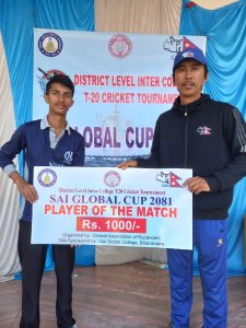 यस्तै, दोस्रो खेलमा टस जितेर ब्याटिङ गरेको साई ग्लोबल ‘ए’ले निर्धारित २० ओभरमा ९ विकेटको क्षतिमा १ सय १२ रन बनायो । उसका लागि अविजित ज्ञवालीले ३३, शैलेन्द्र यादवले १९ र निरज चाईले १५ रन बनाए । बलिङमा खुदाबगरका जावेद खान र अप्सन नेपालीले २–२ तथा सनु मल्लाहले १ विकेट हात पारे ।
