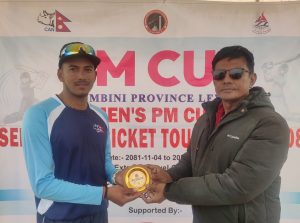 यही फागुन २५ देखि भैरहवाको सिद्धार्थ रंँगशाला, तिलोत्तमाको एक्स्ट्राटेक र लमही राष्ट्रिय क्रिकेट मैदानमा प्रधानमन्त्री कप राष्ट्रिय क्रिकेट प्रतियोगिता हुँदैछ । उक्त प्रतियोगिताका लागि लुम्बिनी प्रदेशस्तरीय टिम छनोटका लागि जिल्ला स्तरको छनोट खेल सुरु भएको हो । रुपन्देही, पश्चिम नवलपरासी, कपिलवस्तु, पाल्पा, दाङ, बाँके र बर्दिया गरी ७ जिल्लाका टिम सहभागि छनोट खेलबाट प्रत्येक जिल्लाका उत्कृष्ट खेलाडी छनोट गरी लुम्बिनी प्रदेशको एउटा टिम बनाइने प्रादेशिक क्रिकेट संघ लुम्बिनी प्रदेशका अध्यक्ष संजय गुरुङले जानकारी दिनुभयो ।