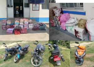 प्रहरीका अनुसार सुट १३० पिस, साडी ६७ पिस, मटर ५ बोरा, बिभिन्न किसिमका मिठाईहरु, चिनी ४ बोरा (१९० किलो), किराना सामानहरु, लु ४९ प १२६८, लु ३४ प ९८०, लु ३३ प ६७१७ र लु ३३ प ६७१७ को मोटरसाइकल तथा लु ४९ प ३७८५ नं.को स्कुटर नियन्त्रणमा लिएको छ ।