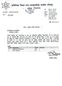 तिलोत्तमा । प्राविधिक शिक्षा तथा व्यावसायिक तालिम परिषद् (सिटिइभिटी) ले तिलोत्तमा नगरपालिकालाई डिप्लोमा इन फार्मेसी र पिसिएल नर्सिङ कार्यक्रम सञ्चालनका लागि पूर्वाधार निर्माण गर्न अनुमति दिएको छ ।
