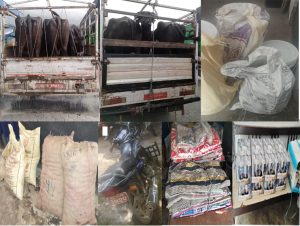 यस्तै इलाका प्रहरी कार्यालय बेलहियाबाट खटिएको प्रहरी टोलीले सिद्धार्थनगर नगरपालिका वडा नं १ बेलहिया बाइपासबाट लेडिज सुट २० थान, भित्री बस्त्र कपडा १६८ पिस र प्लास्टिक स्ट्यान्ड १८० थान बरामद गरेको छ भने इलाका प्रहरी कार्यालय बेथरीबाट खटिएको प्रहरी टोलीले मायादेवी गाउँपालिका वडा नं. ६ गुरबनियाबाट लु ६१ प ९१६९, लु ३१ प ५५५९, लु ४२ प ५८६०, लु २३ प ८८१९न.को मोटरसाइकलमा ल्याउदै गरेको बेवारिसे अवस्थामा राखेको चिनी ६ बोरा, सुकेको खुर्सानी ७ बोरा, धनिया ५ बोरा र जिमा मल ४ बाल्टी मोटरसाइकल सहित बरामद गरेको छ ।