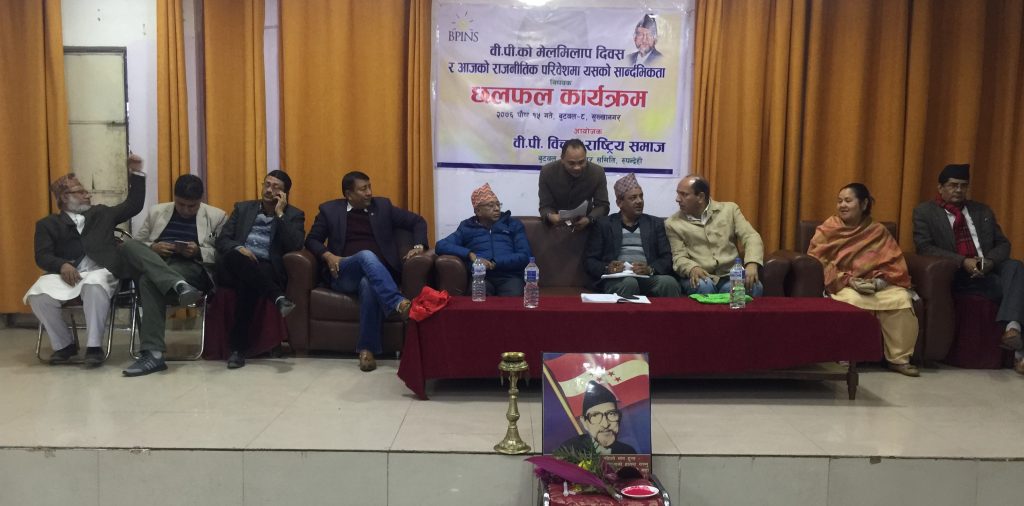 बी पी बिचार राष्ट्रिय समाज बुटवल उपमहानगर समितिद्वारा मंगलबार बुटवलमा आयोजित ‘बी पी को मेलमिलाप दिवस र आजको राजनीतिक परिवेशमा यसको सान्दर्भिकता’ बिषयक छलफल कार्यक्रममा बोल्ने वक्ताहरुले उक्त कुरा बताएका हुन् ।