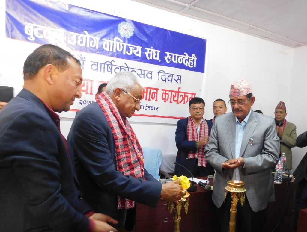 त्यस अवसरमा संघका अध्यक्ष खिमबहादुर हमालले संघको स्थापनाकाल देखि नै यस क्षेत्रको बिकासमा योगदान गर्दै आएको स्मरण गर्दै संघकै पहलमा बुटवल बुहुमुखी क्याम्पसको बिज्ञान भवन निर्माण, लुम्बिनी बाणिज्य क्याम्पस र सिद्धार्थ गौतम बुद्ध क्याम्पसका स्थापना, लुम्बिनी प्रोदशिक अस्पतालमा प्रसुती कक्ष तथा क्याविन निर्माण, सिद्धार्थ बाल तथा महिला आस्पताल (आम्दा) लगायतको स्थापनामा बुटवल उद्योग बाणिज्य संघको योगदान रहेको जानकारी गराउनु भयो । अध्यक्ष हमालले यस क्षेत्रको बिकासकालागि साझेदारी गर्न संघ तयार रहेको समेत जानकारी गराउनु भयो ।