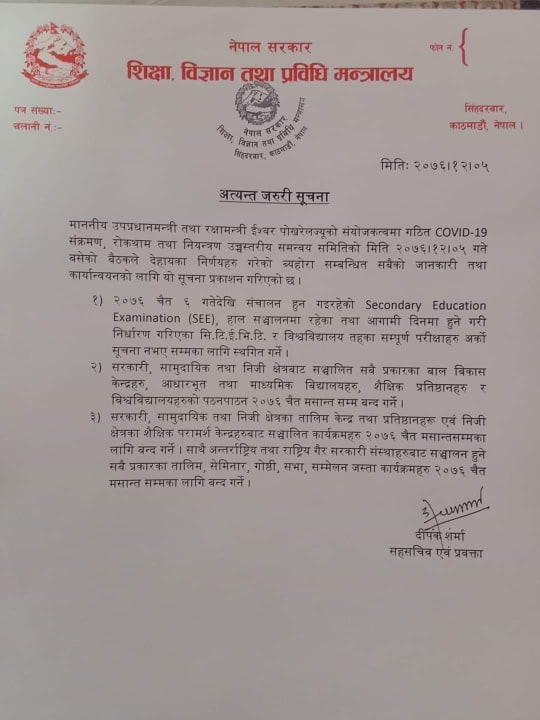 उपप्रधानमन्त्री तथा रक्षामन्त्री ईश्वर पोख्रेलको संयोजकत्वमा गठित कोभिड—१९ संक्रमण, रोकथाम तथा नियन्त्रण उच्चस्तरिय समन्वय समितिको आज बसेको बैठकले एसईई परीक्षा लगायत अन्य परीक्षा तथा सभा, सम्मेलन, गोष्ठि र तालिम अर्को सूचना नभएसम्मका लागि बन्द गर्ने निर्णय गरेको हो ।