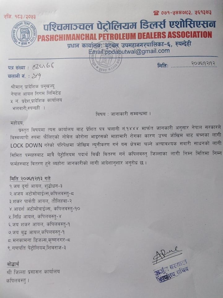 एशोसिएसनले चैत १३ गते बिहिबार ईन्धन विक्री वितरणको जिम्मेवारी पाएका रुपन्देही, कपिलवस्तु र नवलपरासी जिल्लाका पेट्रोल पम्पहरुको नामावली सहित नेपाल आयल निगम ५ नं. प्रादेशिक कार्यालय भलवारीमा पत्राचार गरी त्यसको जानकारी सम्वन्धित पम्प ब्यवसायीहरुलाई गराइसकिएको एशोसिएसनका कार्यालय सचिव अर्जुन बश्यालले बताउनु भयो ।