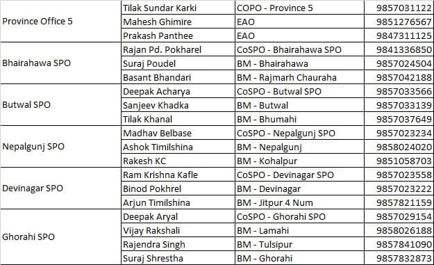 ग्राहक सेवा केन्द्र अन्तर्गत प्रदेश कार्यालयमा बैंकका प्रदेश प्रमुख तिलकसुन्दर कार्कीका साथै महेश घिमिरे र प्रकाश पन्थीलाई सम्पर्क व्यक्ति तोकिएको छ । त्यस्तै भैरहवा एसपिओ कार्यालयका लागि राजनप्रसाद पोखरेल, सुरज पौडेल र वसन्त भण्डारीलाई सम्पर्क व्यक्ति तोकिएको छ भने बुटवल एसपिओका लागि दिपक आचार्य, सञ्जीव खड्का र तिलक खनाललाई सम्पर्क व्यक्ति तोकिएको छ ।
