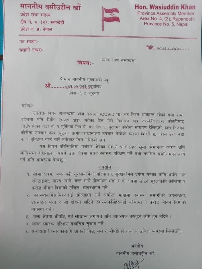 शुक्रवार रुपन्देहीको दक्षिणी क्षेत्र कोटहीमाईका २७ वर्षिय एक पुरुषमा कोरोना संक्रमण देखिएपछि त्यस क्षेत्रबाट प्रतिनिधित्व गर्ने सांसद खाँले प्रदेश नं ५ का मुख्यमन्त्री शंकर पोखरेललाई भेटेर ध्यानाकर्षण पत्र बुझाउदै सिमाक्षेत्रमा खटिने सुरक्षाकर्मी र स्वास्थ्यकर्मीलाई आवश्यक पर्ने स्वास्थ्य तथा सुरक्षा सामाग्रीको व्यवस्था मिलाउनुका साथै कम्तिमा १ करोडको विमाको व्यवस्था गर्न माग गर्नु भएको छ ।